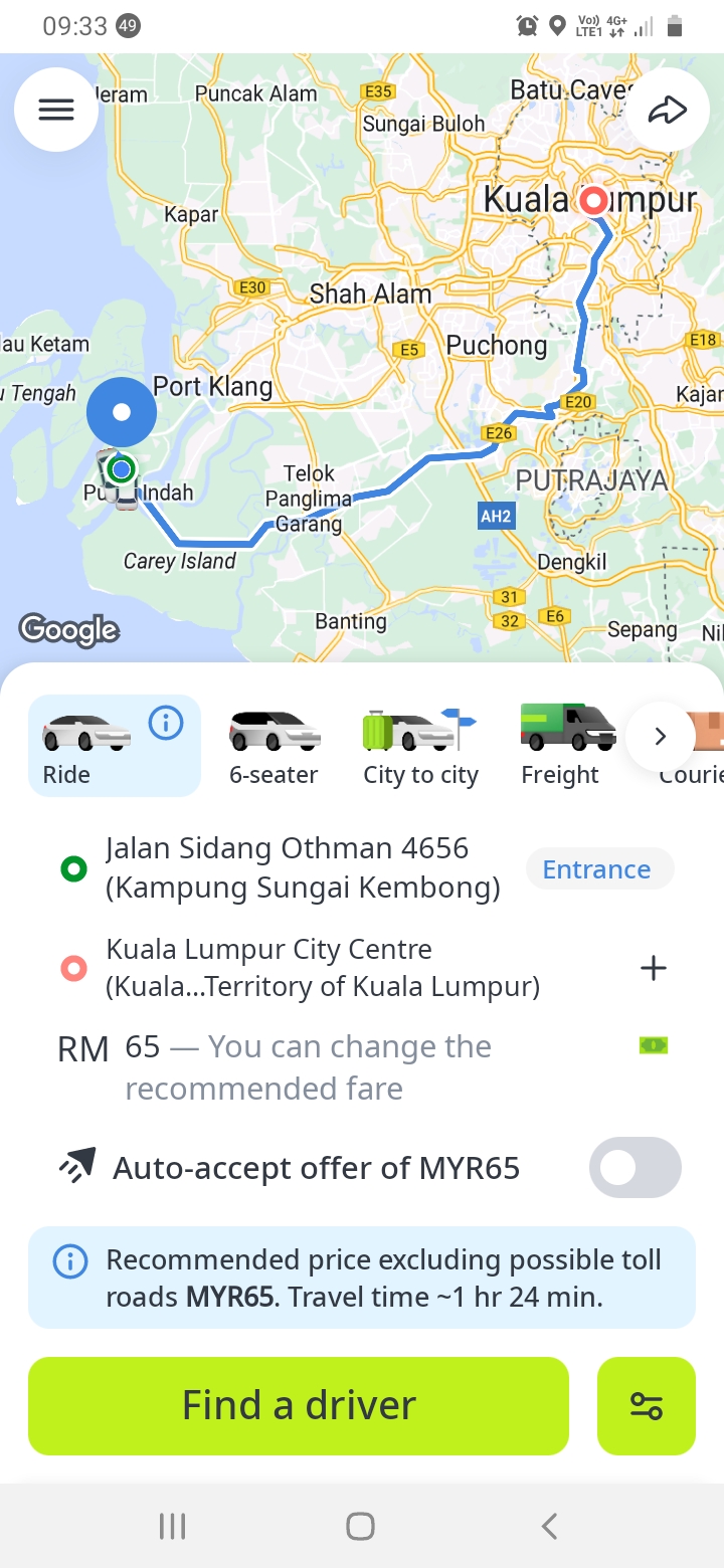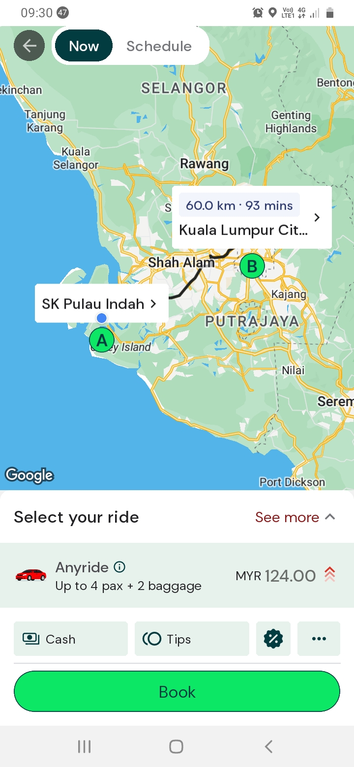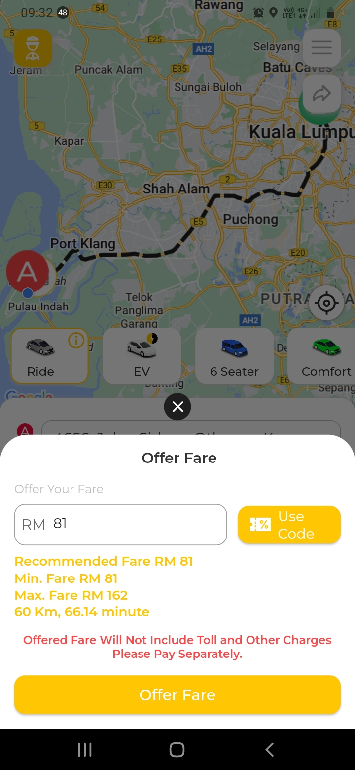Kadar tambang applikasi ehailing tempatan pada hari ini 4.6.24 10:00 pagi..