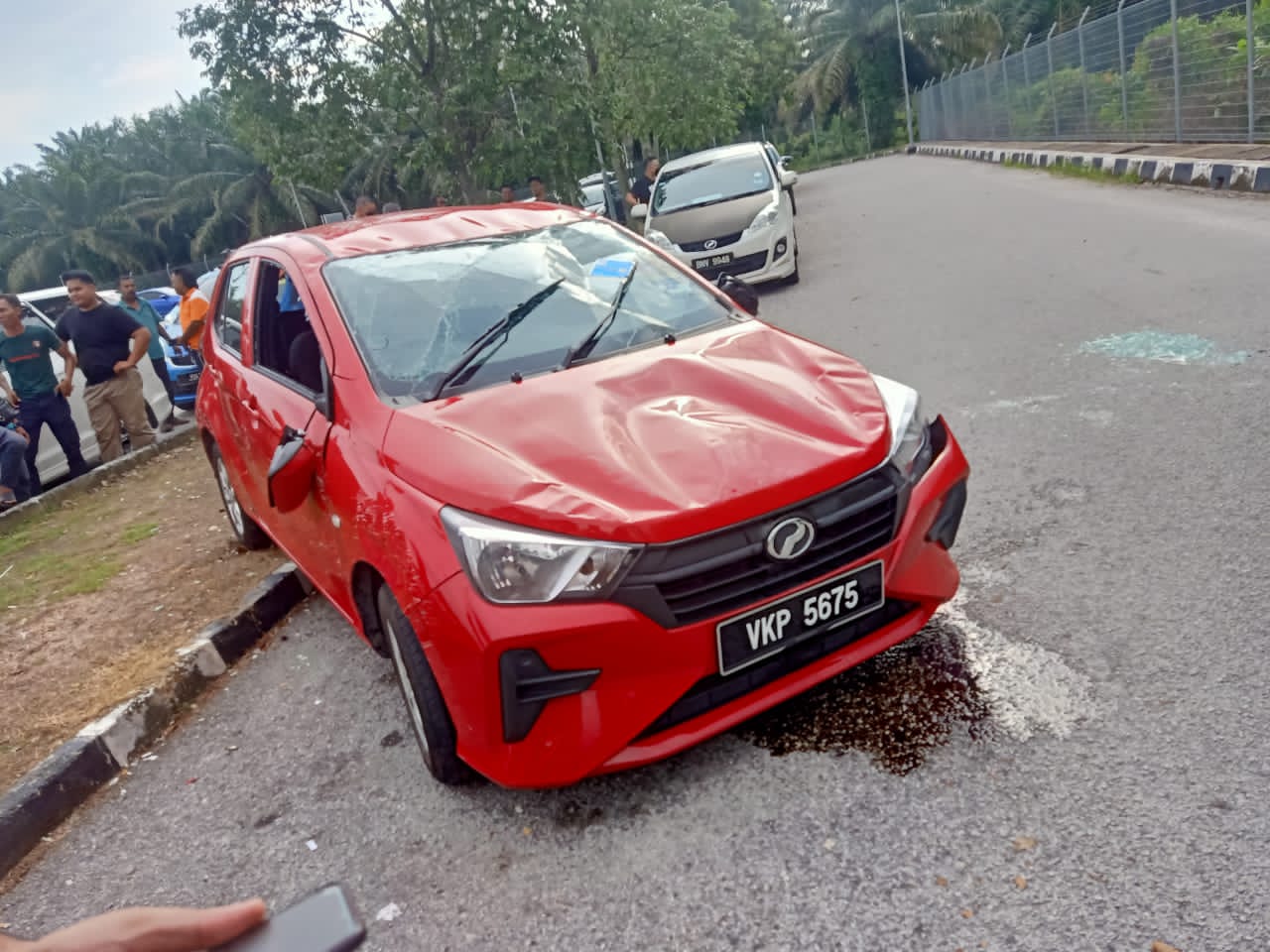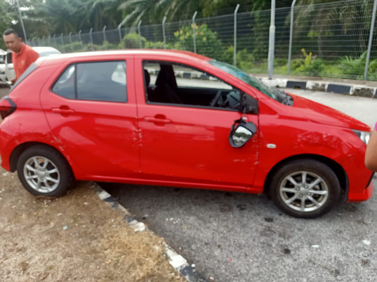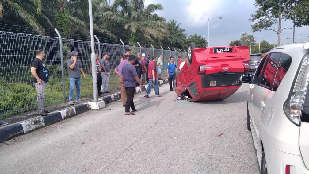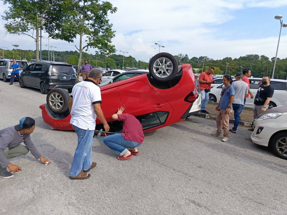 Terkejut abang-abang pemandu ehailing yang sedang berehat sambil menunggu Q di Landside KLIA apabila sebuah kereta secara tiba-tiba terbalik empat tayar ke atas.
