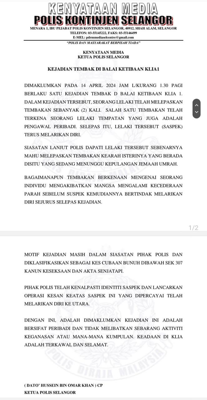 Siaran media Ibu Pejabat Polis Kontijen Selangor berkenaan kejadian tembak di KLIA 1 pada awal pagi tadi.